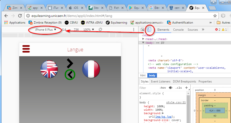 - Activer l'option “device toolbar” ([Ctrl]+[Shift]+[M]) pour afficher l'écran tel qu'il apparaîtrait sur un appareil mobile donné