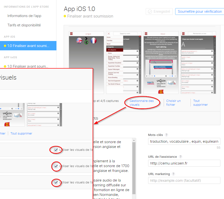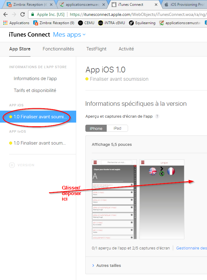- Glisser-déposer le fichier ainsi généré sur la page iTunes Connect de l'application (https://itunesconnect.apple.com/WebObjects/iTunesConnect.woa/ra/ng/app/1122069377)