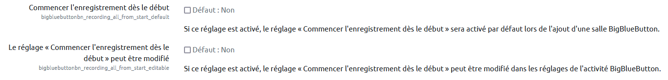 Dans la partie administration de Moodle, il y a un paramètre Commencer l'enregistrement dès le début ( bigbluebuttonbn_recording_all_from_start_default ). Si la case de ce paramètre est cochée, le réglage correspondant est activé.