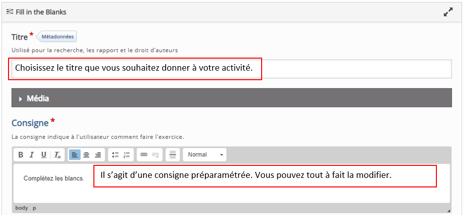 Dans un premier temps, vous devrez ajouter un titre et écrire votre consigne (voir capture ci-dessous) :
