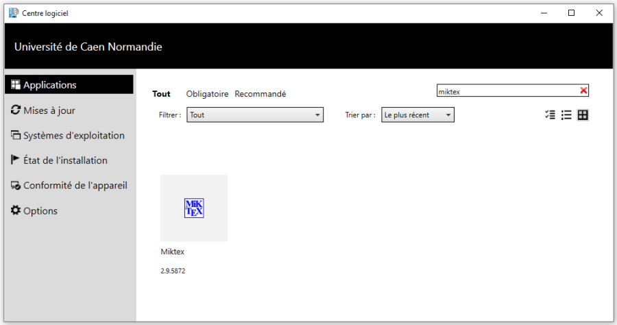 - MiKTeX est une distribution légère de LATEX avec une installation pratique de paquets à la demande. Elle se trouve dans le centre logiciel, vous pouvez donc l'installer même si vous n'êtes pas administrateur de la machine.