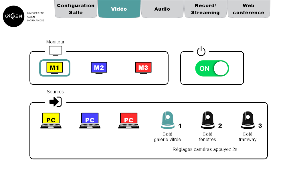 • Moniteur: Sélection du moniteur M1 (cadre bleu-vert) et allumage de celui-ci (interrupteur sur ON).