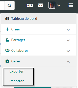 Le menu de la plateforme est accessible depuis l’icône situé tout en haut à droite de la page. Vous voyez après avoir cliqué sur l'icône qu’en plus du « Tableau de bord », le menu distingue 4 catégories.