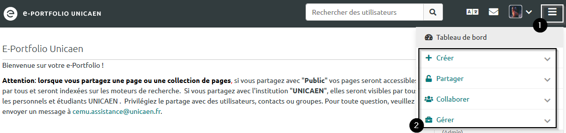 « Créer » correspond à votre espace personnel. Il vous permet de stocker des fichiers, de saisir des informations, de collecter toutes les traces de votre formation. Tant que vous n’intégrez pas ces informations ou ces fichiers sur des « Pages » de votre eportfolio, et tant que vous ne partagez pas ces pages avec d’autres utilisateurs, toutes ces données restent privées.