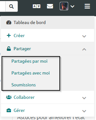 « Partager » vous permet de retrouver toutes les « Pages » que vous avez partagées avec d’autres utilisateurs de la plateforme ou que d’autres utilisateurs ont choisi de partager avec vous.