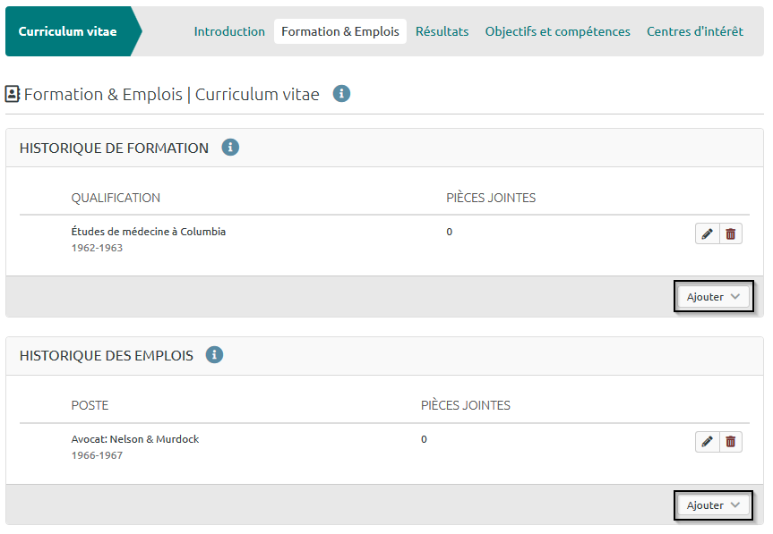 Dans l’onglet « Formation & Emplois », ajoutez l’historique de vos formations et des emplois occupés.