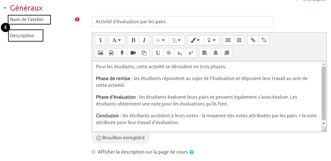4. Donnez un nom à l’atelier dans le champ « Nom de l’atelier ». Renseignez la « Description » de l’atelier. Cette description sera visible par les étudiants « Phase de mise en place », avant qu’ils puissent remettre leur travail.