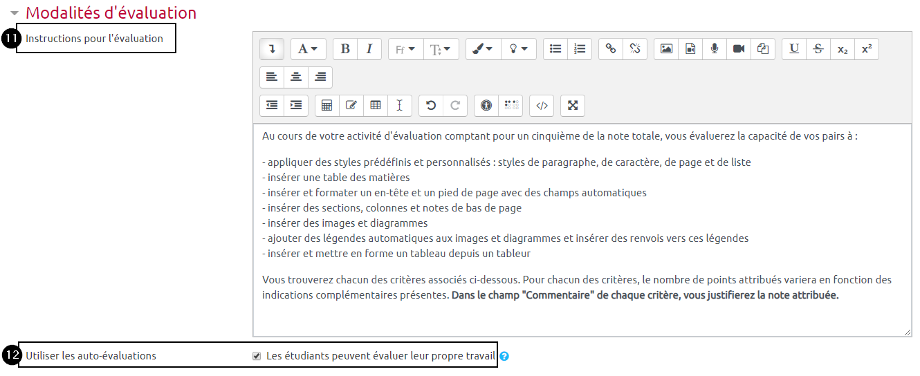 11. À la rubrique « Modalités d’évaluation », renseignez les « Instructions pour l’évaluation ». Ces instructions seront visibles par les étudiants pendant toute la durée de la phase d’évaluation. Elles doivent aider les étudiants à comprendre ce qui est attendu d’eux.