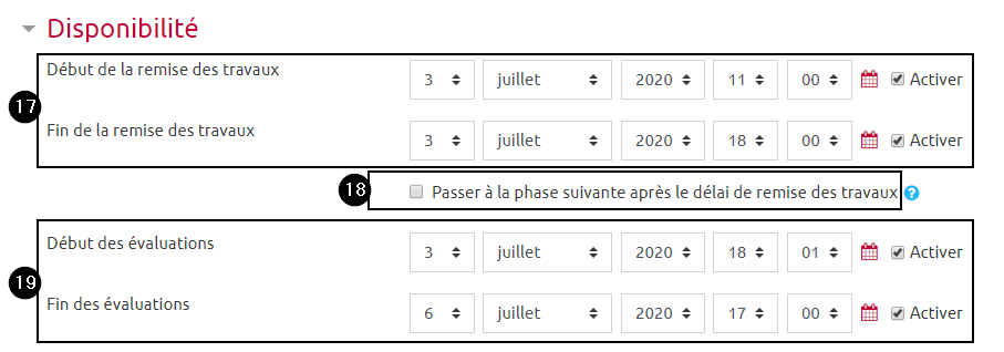 19. Définissez la plage d’ouverture de l’activité d’évaluation à proprement parlé. Cochez les cases « Activer », puis définissez les dates et heures appropriées. Attention, la date de début des évaluations doit être postérieure à celle de fin de remise des travaux.