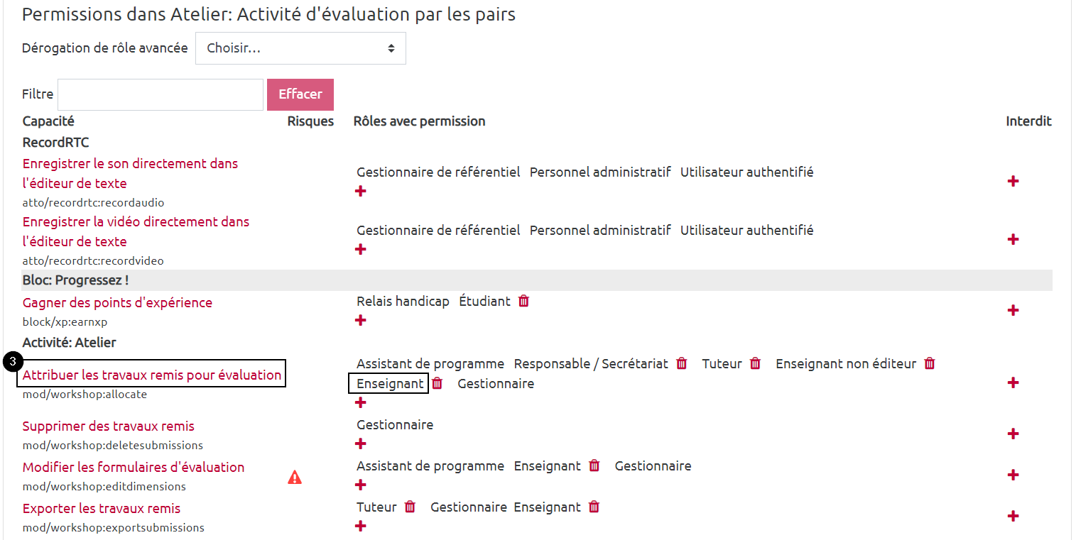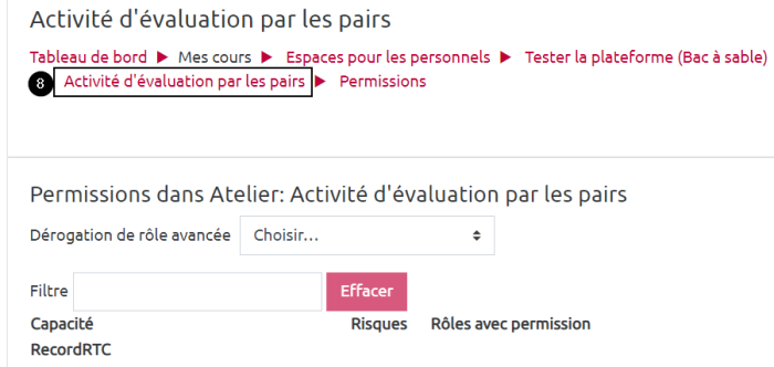 Vous avez la possibilité de choisir si les étudiants verront qui ils évaluent et le nom des étudiants qui les évaluent. Cela nécessite que vous gériez les “permissions” de l'activité “atelier”.