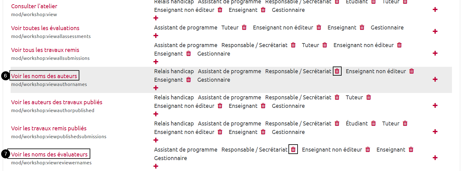 Pour supprimer une permission, cliquez sur l'icône représentant une poubelle située à droite du nom du “rôle” - les étudiants ont le rôle “étudiant”, les enseignants ont le rôle “enseignant” ou éventuellement “enseignant non éditeur”.