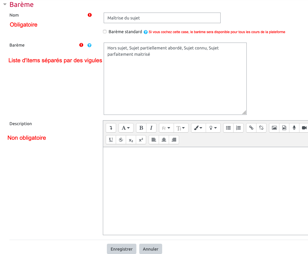 Les barèmes peuvent être utilisés dans les activités Forum, Glossaire, Base de données, Leçon et Devoir pour l'évaluation et la notation des productions des étudiants.