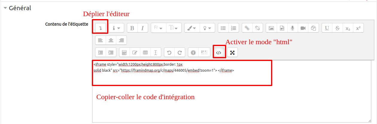 - dépliez l'éditeur et cochez le mode “html” en cliquant sur <>