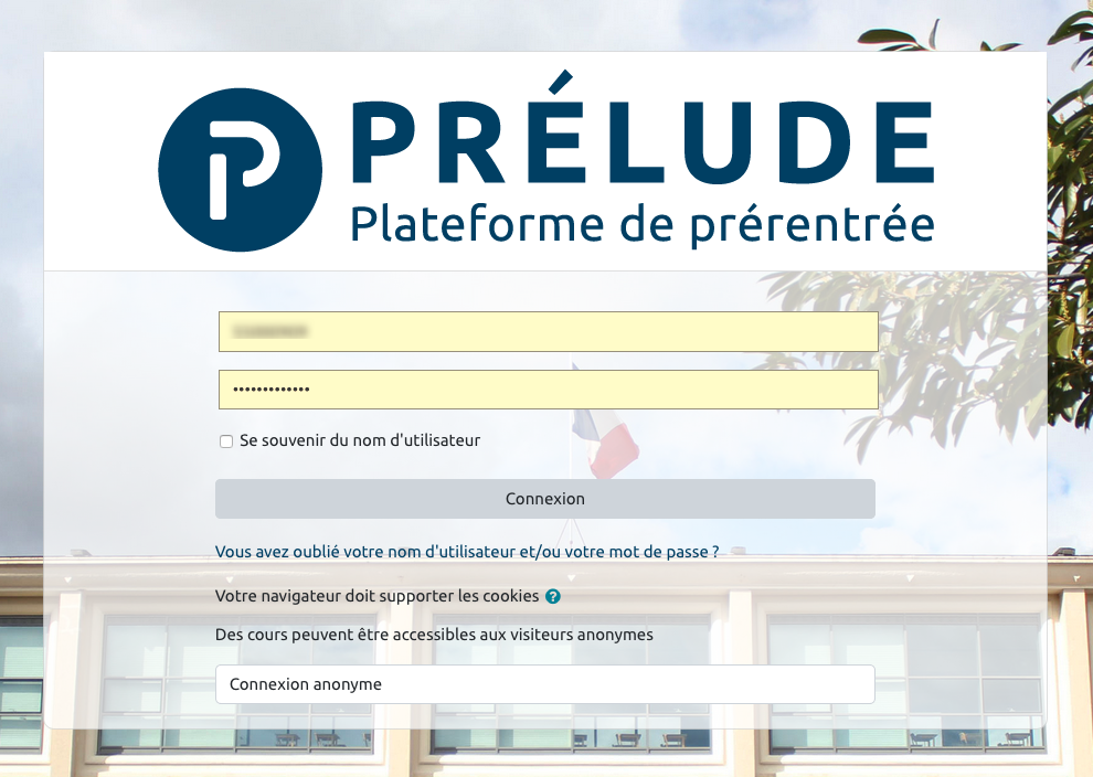 La plateforme prélude n'utilise pas la méthode d’authentification habituelle par CAS qui vous permet avec une seule authentification d'accéder à un ensemble de services numérique. En conséquence, même si vous êtes déjà authentifié sur un autre service (zimbra, Ecampus, etc.), vous devrez retaper vos codes pour accéder à Prélude.
