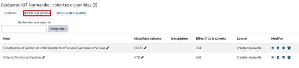 Contrairement à Ecampus et Collegium, sur PRELUDE, les cohortes ne sont pas automatisée par rapport au système d'information. Il est donc nécessaire de les créer manuellement pour pouvoir les utiliser ensuite , en particulier pour l'inscription en masse (voir Importer des utilisateurs sur la plateforme PRELUDE.