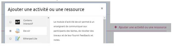 Entrez dans le mode « Édition » et cliquez sur le bouton « Ajouter une activité ou une ressource » et sélection l’option « Devoir ».