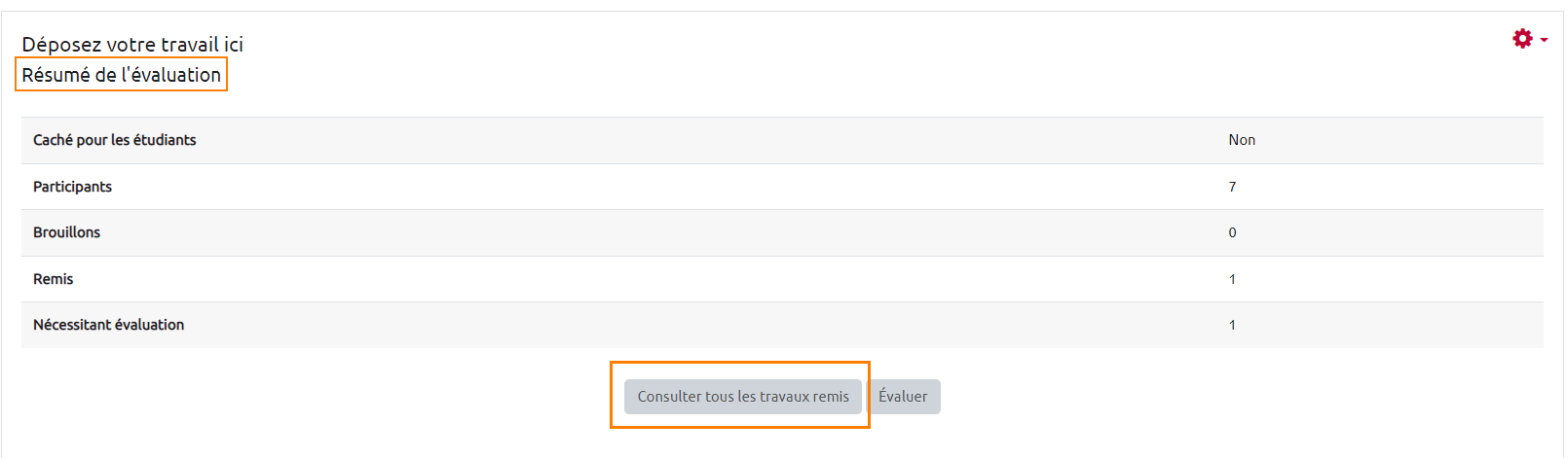 - Sur la nouvelle page, cliquer sur “Consulter/évaluer tous les travaux remis”. Cette option se trouve sous le “Résumé de l'évaluation”.
