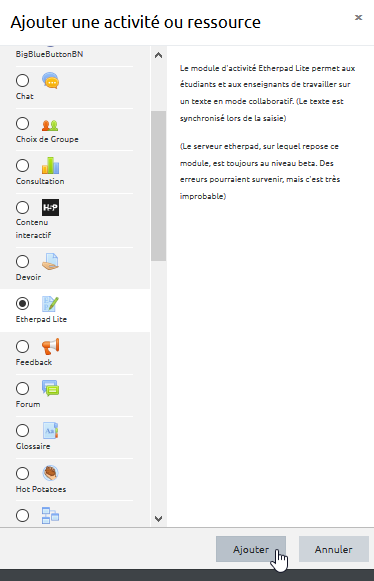 Étape 1 : lancer l'ajout d'une activité Etherpad