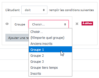 - n activités BBB pour n groupes (voir Créer et utiliser une webconférence BigBlueButton (BBB)) en paramétrant l'accès restreint comme l'Etherpad ci-dessous) ;