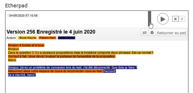 Tout les actions dans l'Etherpad sont enregistrées. Il suffit de naviguer dans l'historique pour retrouver un message, qui l'a écrit et quand.