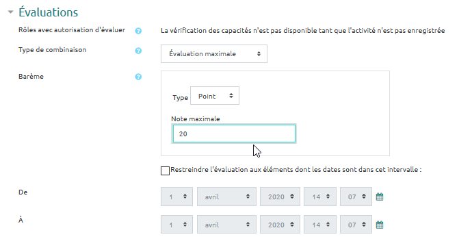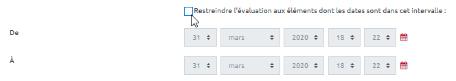 - Dans les paramètres “Évaluation” du forum, cliquer sur la case “Restreindre l'évaluation aux éléments dont les dates sont dans cet intervalle” puis indiquer les dates souhaitées :