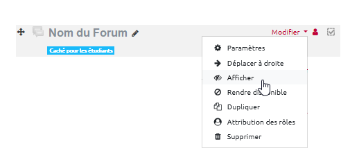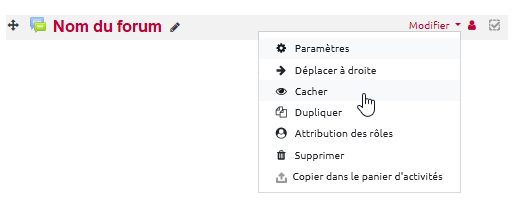 - Créer le forum selon la méthode proposé dans la documentation : Créer un forum en choisissant pour le paramètre “Réglages courants” / “Disponibilité”, l'option “Cacher pour les étudiants” :