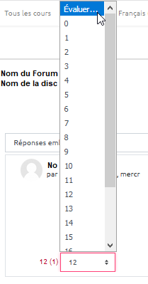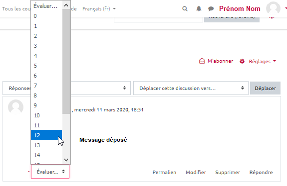 - Refaire la démarche décrite à l'étape 2 et choisissez la nouvelle note. Si vous souhaiter supprimer la note d'un message, cliquer dans le menu déroulant sur “Évaluer…” comme indiqué ci-dessous :
