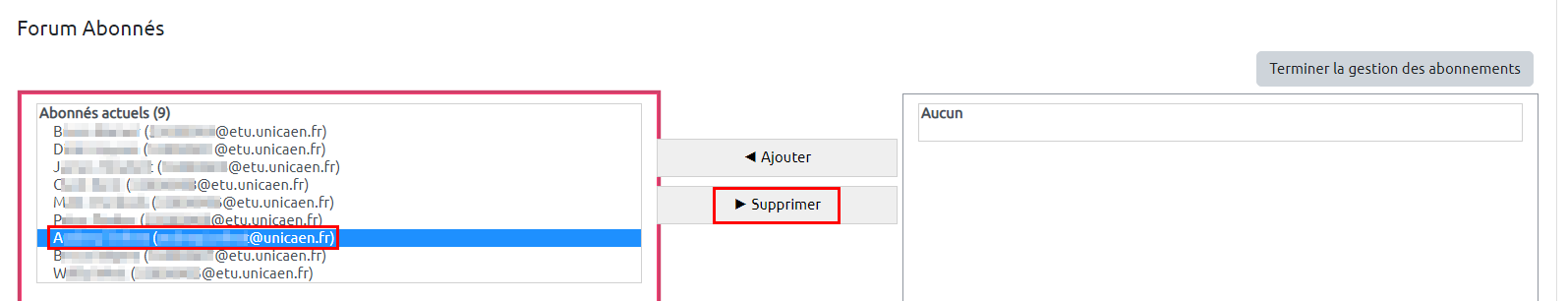 Étape 4 : sélectionner la ou les personne(s) à désabonner dans la colonne "Abonnés actuels", puis cliquer sur le bouton gris "Supprimer