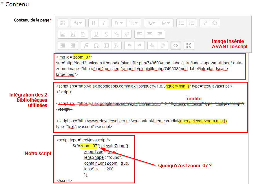 Il faut préparer 2 images: une petite (celle que l'on va voir en premier et une tres grande.). Sur mon test une image en 600×800 et une en 1920X Ensuite les installer sur Moodle (dans un dossier, télécharger les images et “rendre disponible” le dossier pour le cacher sur la page de cours) puis récupérer leurs url. Exemple de code à insérer dans l'éditeur, en mode html: