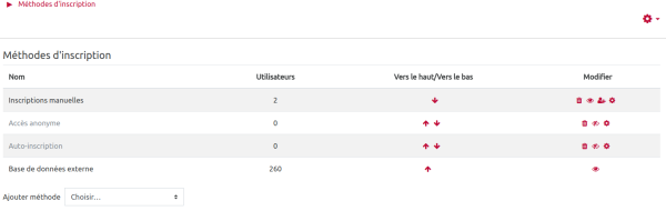 - la méthode d'inscription dans l'espace de cours (base de données, synchronisation de cohorte, manuelle, auto-inscription, etc.) ;