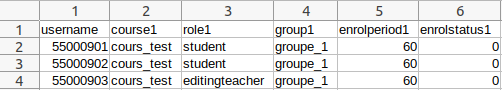 - si un usager doit être inscrit dans plusieurs cours en même temps, vous pouvez selon votre préférence soit créer un ligne d'inscription par cours, soit poursuivre votre première ligne avec le chiffre 2 et + : course2,role2,group2,enrolperiod2,enrolstatus2,course3,role3,etc.