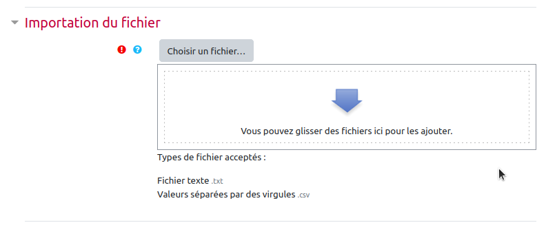 Lors de l’importation, Moodle renvoie les erreurs qu'il a détecté comme dans l'exemple suivant :