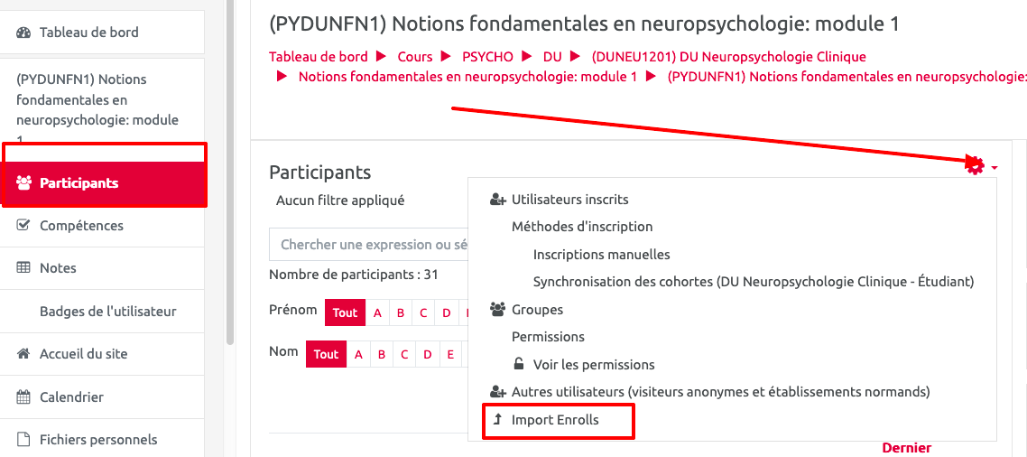 - Sélectionner la fonctionnalité “importation des inscriptions (ou en anglais “Import Enrolls”) comme indiqué dans l'impression écran ci-dessous :