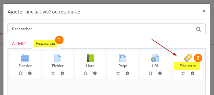- Ajouter une 'étiquette' à partir de l'onglet 'Ressource' disponible à partir du lien 'Ajouter une activité ou ressource“ quand le mode édition est activé.