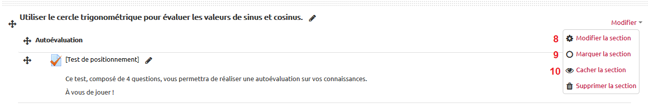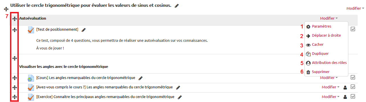 - Déplacement de la ressource ou activité dans la section/cours.
