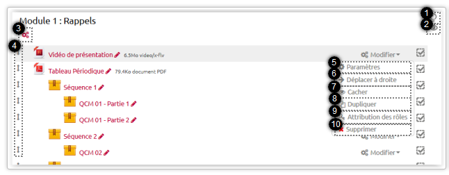 - Différents blocs du cours (certains par défaut et d'autres ajoutés manuellement par l'enseignant)