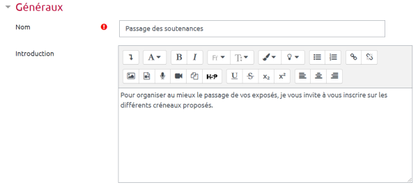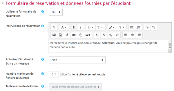 Vous pouvez, si vous le souhaitez, utiliser le formulaire de réservation. En utilisant le formulaire, les étudiants commenceront par voir le message avant de répondre à l'activité. Vous pouvez également, via le formulaire, demander aux étudiants des informations complémentaires (dépôt de fichier par exemple).