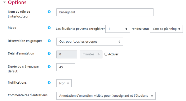 Les paramètres suivants sont relativement transparents. Si besoin, vous pouvez cliquer sur le point d'interrogation bleu pour avoir plus de renseignement pour chaque paramètre. Dans l'exemple si après par exemple, on remarque que l'interlocuteur est l'enseignant (mais cela pourrait très bien être le secrétariat par exemple dans le cadre de réservation pour les examens), que les créneaux horaires sont de 45 minutes et que les étudiants s'inscrivent en groupe, dans un seul créneau.