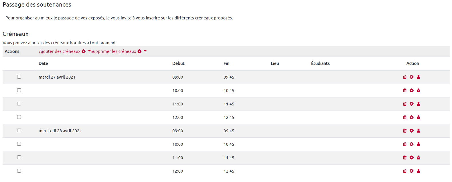 Les étudiants peuvent désormais s'inscrire dans les créneaux proposés. Voici un aperçu étudiant :