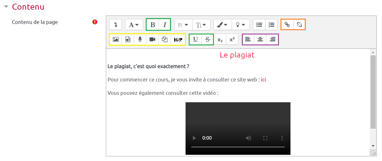 Dans l'exemple ci-contre, les outils de mise en forme ont été utilisés, un lien et une vidéo ont également été ajoutés.