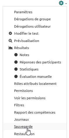 - Cliquer sur l'activité visée, puis sur le rouage et enfin sur “Sauvegarde” dans le menu déroulant :
