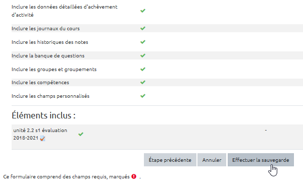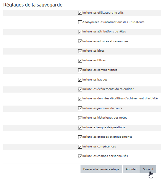- Pour conserver les contributions et résultats des étudiants, il est conseillé de tout cocher sauf “Anonymiser les informations des utilisateurs” puis cliquer sur “Suivant” :