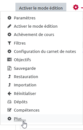 - Accéder aux paramètres du cours en cliquant sur le rouage puis sur “Plus…” :