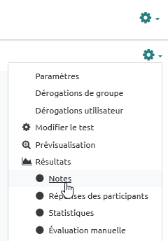 - Cliquer sur le rouage du test, puis dans le menu déroulant sur “Note” :