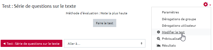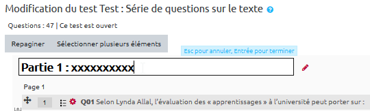 Maintenant que le test est chapitré, l'option “Mélanger” ne brassera que les questions des sections pour lesquelles l'option est cochée :