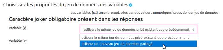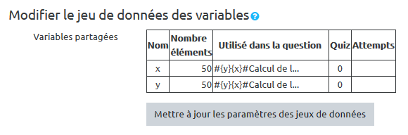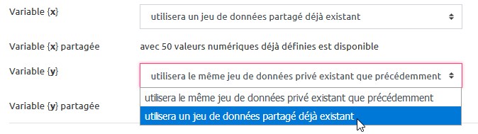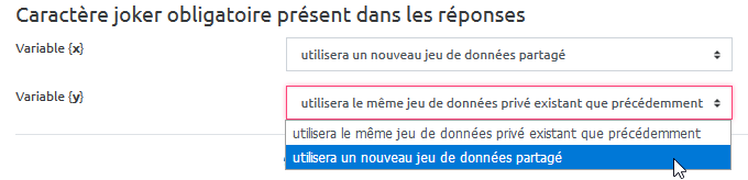 - Techniquement, lors du démarrage d'une tentative, la plateforme sélectionne au hasard une valeur pour chaque variable parmi les jeux de données possibles. La valeur sélectionnée d'une variable reste la même dans toutes les questions utilisant le même jeu de données partagées.