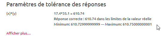 - une tolérance de 0,1 de type Relatif signifie qu'une erreur de 10 % est acceptée. Appliqué à une valeur réponse de 100, cela signifie que l'on accepte l'intervalle [90;110]. Ce type de tolérance est utile lorsque la magnitude de la réponse correcte peut différer beaucoup d'une valeur du jeu à l'autre ;