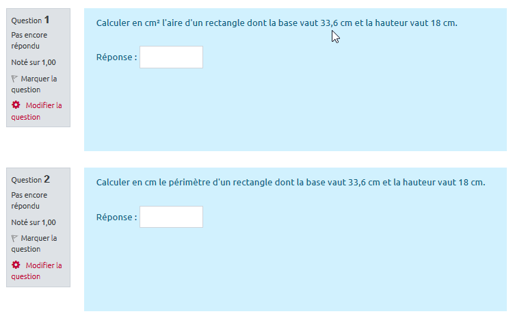 - Concrètement, lors d'une tentative, le candidat pourra avoir plusieurs questions qui utilisent la même valeur pour une variable donnée. Par exemple, on pourra demander au candidat de calculer l'aire puis le périmètre d'un rectangle dont les dimensions sont identiques.