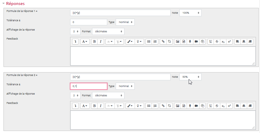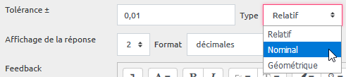 - une tolérance de 0,1 de type Nominal signifie que seront acceptées les réponses comprises dans un intervalle de 0,01 autour de la réponse exacte (+/- 0,1) Appliqué à une valeur réponse de 100, cela signifie que l'on accepte l'intervalle [99,9;100,1]. Ce type de tolérance peut être utile lorsque la différence entre les réponses correctes est petite ;