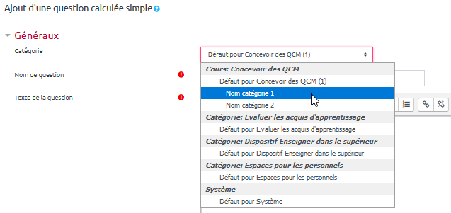 Si vous n'avez pas créé de catégorie spécifique pour classer vos questions, laisser la catégorie par “Défaut pour [nom du cours]”. Si vous souhaitez en savoir plus sur le classement des questions, reportez-vous à la documentation : Créer et gérer une banque de questions.
